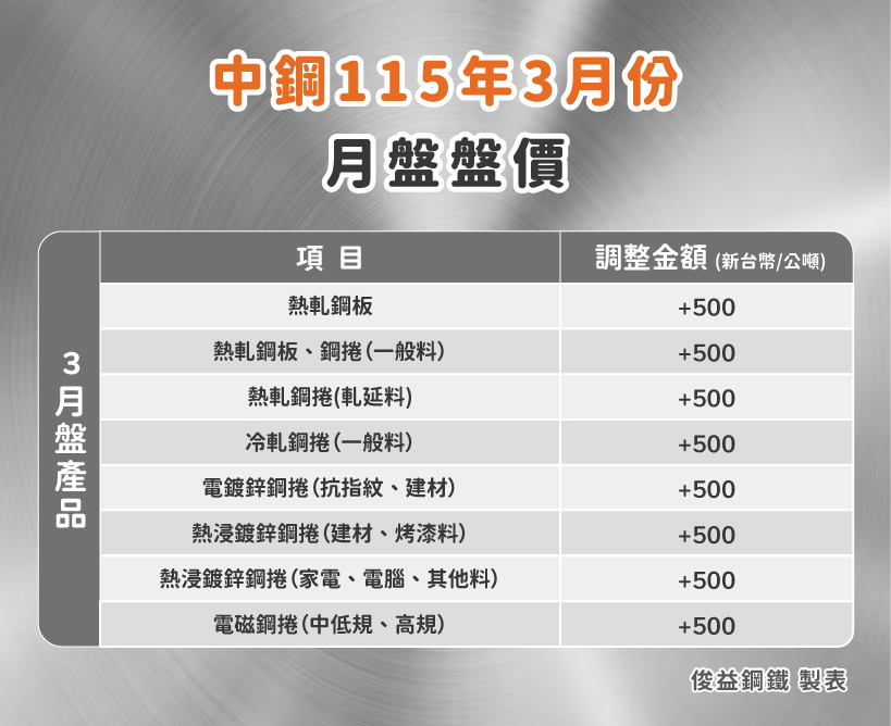 中鋼3月盤價全品項調漲500元,包括熱冷軋鋼捲等,具體調整如下: